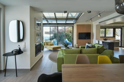 The design drives inspiration from pop and op art. Most of the furniture has simple geometrical lines and is conceived as comfortable volumes in space. Bespoke pieces like the headboard/sideboard of the basement and the wooden cladding of the dining area stand as an artistic backdrop for the free standing furniture. The final result is a colour blocking synthesis, enriched with natural materials and decorative objects with references to the Greek Art Scene.
